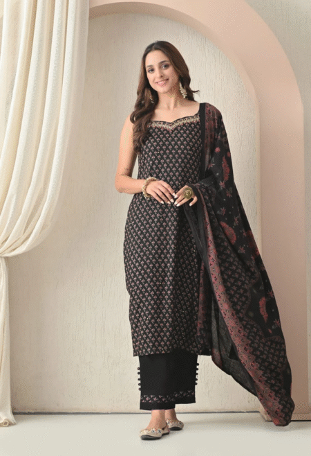 ₹2,699.00 – ₹2,799.00Price range: ₹2,699.00 through ₹2,799.00Midnight Petals: The timeless elegance of black is reimagined with romantic pink and opulent gold floral motifs. This piece is the epitome of dramatic glamour, ideal for evening receptions, cocktail parties, and any occasion where you want to captivate.