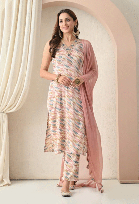 ₹2,699.00 – ₹2,799.00Price range: ₹2,699.00 through ₹2,799.00Blush Harmony: A delicate fusion of soft pastel pink and vibrant multicolor ikat patterns, elevated with intricate embroidery. This piece offers a modern bohemian vibe, perfect for daytime weddings, brunches, and spring celebrations. Effortlessly chic and beautifully unique.