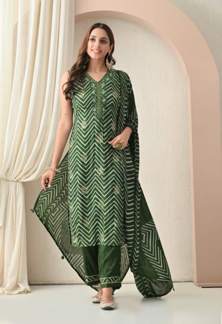 ₹2,899.00 – ₹2,999.00Price range: ₹2,899.00 through ₹2,999.00Emerald Grace: Command attention in deep green, adorned with a sharp white chevron pattern and luxurious embroidery. This bold and graphic design is a modern classic, perfect for formal galas, holiday parties, and making an unforgettable entrance.