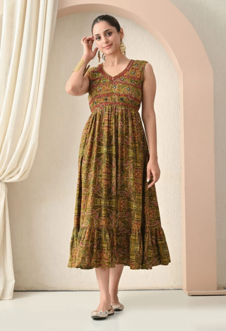 ₹1,699.00 – ₹1,799.00Price range: ₹1,699.00 through ₹1,799.00Rustic Heritage: Grounded in earthy olive green and adorned with a bold red and blue ethnic print. This piece connects to timeless traditions with a rustic, authentic vibe, perfect for cultural events, family gatherings, and festive holidays.