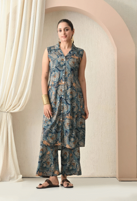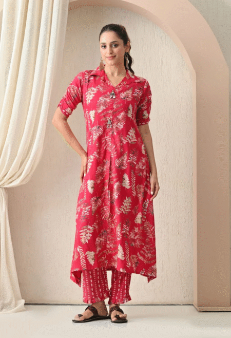 ₹1,999.00 – ₹2,099.00Price range: ₹1,999.00 through ₹2,099.00A stunning red rayon kurti featuring golden leaf prints, perfect for festive and casual outings.