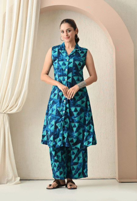 ₹1,999.00 – ₹2,099.00Price range: ₹1,999.00 through ₹2,099.00A chic rayon dress in navy and teal, designed with abstract triangular patterns for a bold and modern look.