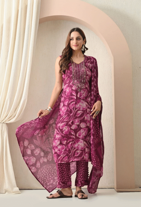 ₹2,699.00 – ₹2,799.00Price range: ₹2,699.00 through ₹2,799.00A plum rayon kurti with mirror work and embroidery, paired with a matching dupatta.