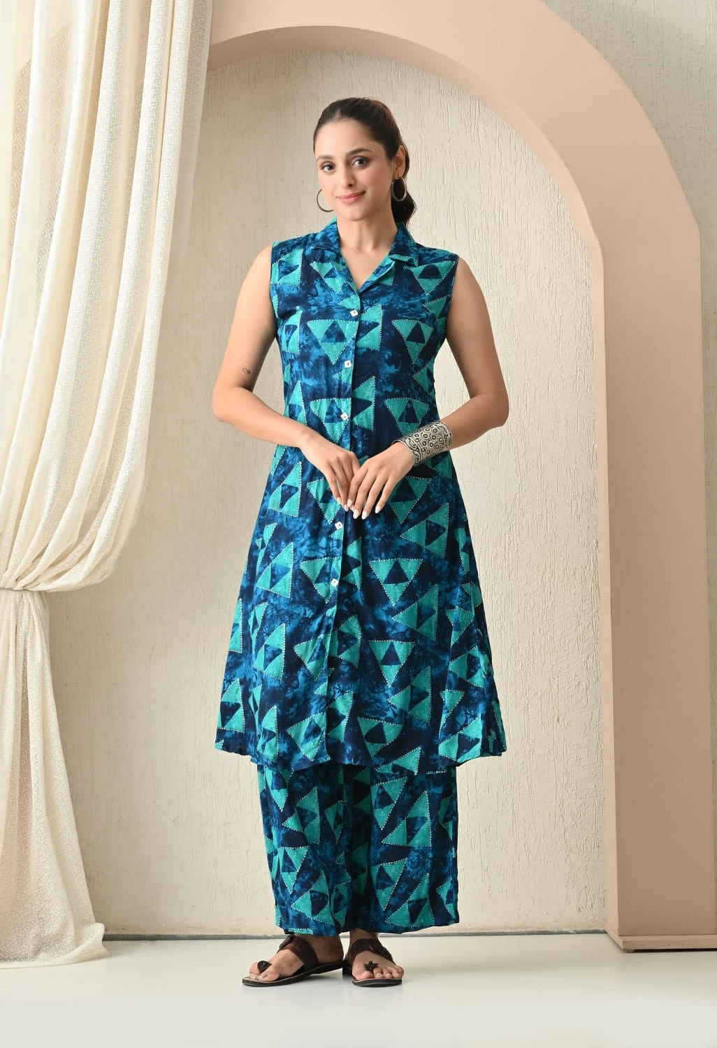 Stay effortlessly stylish with Aqua Geometry. Crafted in rayon, this sleeveless dress features a dark navy backdrop with teal geometric triangles and tie-dye textures. Perfect for casual wear, holidays, or day-to-night transitions, its lightweight fabric ensures ease and comfort. Pair with silver bangles or hoop earrings to complete the look.