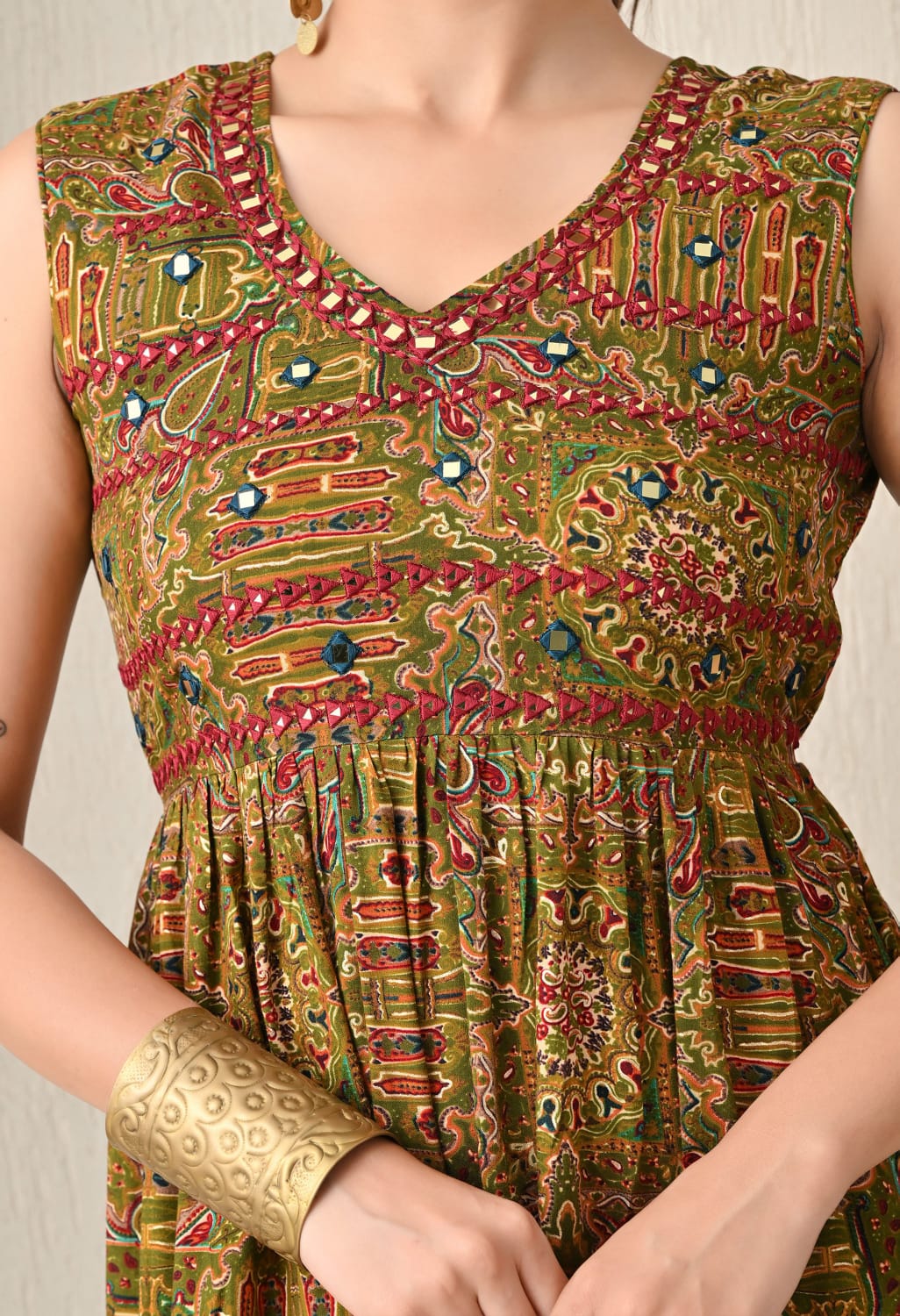 Rustic Heritage: Grounded in earthy olive green and adorned with a bold red and blue ethnic print. This piece connects to timeless traditions with a rustic, authentic vibe, perfect for cultural events, family gatherings, and festive holidays.